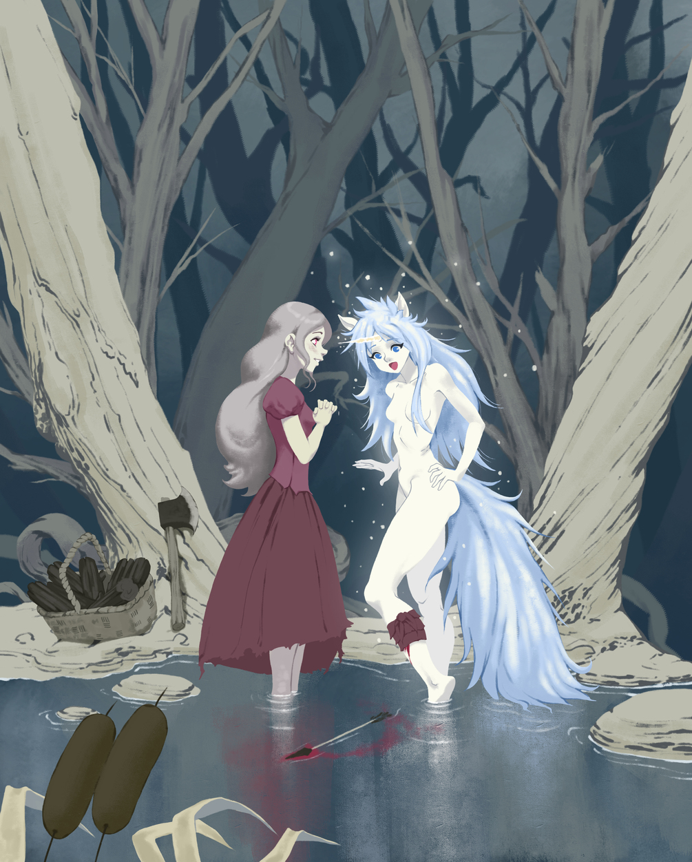 A filha do lenhador estava mais uma vez sentada na raiz de uma árvore, à beira do lago, à espera da fada. A menina mirava a lua e os arredores em alternância, como quem checa o relógio. Ao baixar o rosto do céu pela enésima vez, deparou-se com um brilho cintilante sobrevoando a superfície da água. O brilho tomou forma, ganhou cascos, crina e um chifre, e se aproximou a galope até parar diante da menina.